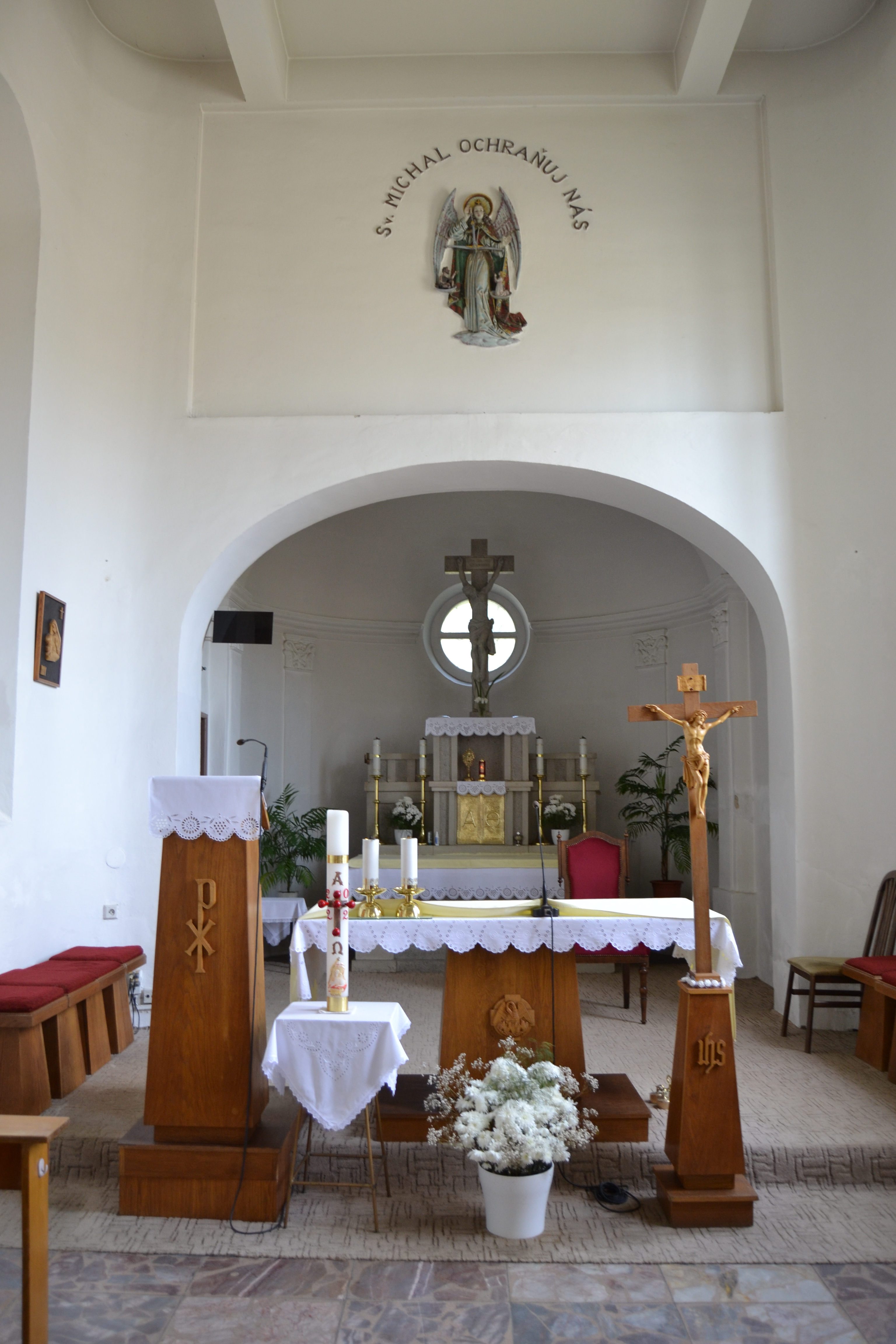 Farský kostol sv. Michala archanjela v Karlovej Vsi stojí na mieste bývalej kaplnky sv. Jána Nepomuckého, ktorá bola postavená na sklonku 18. storočia. Kaplnku v roku 1935 prestavali a rozšírili a takto vznikol jednoloďový kostol s polkruhým uzáverom presbytéria. Presbytérium je zaklenuté polkupolou postavenou na rímske a pilastroch so štylizovanými hlavicami. Pôvodná loď kaplnky i prístavba novej priestrannejšej lode majú oceľovobetonový rovný strop. Na západnej strane je vstavaná vežička s ihlancovou strechou. V osi veže je situovaný hlavný vstup. V interiéri je na čelnej stene pred presbytériom umiestnený reliéf sv. Michala archanjela. V presbytériu je umiestnený svätostánok, nad ktorým sa vyníma kamenný kríž. V zadnej časti kostola sa nachádza chór s elektrickým organom. Vystupuje sa naň po točitom schodisku. Mobiliár kostola pochádza z čias modernizácie sakrálneho objektu. Interiér kostola je jednoduchý. Kostol patrí pod karloveskú farnosť minoritov - menších bratov konventuálov. Má kapacitu okolo 100 osôb.