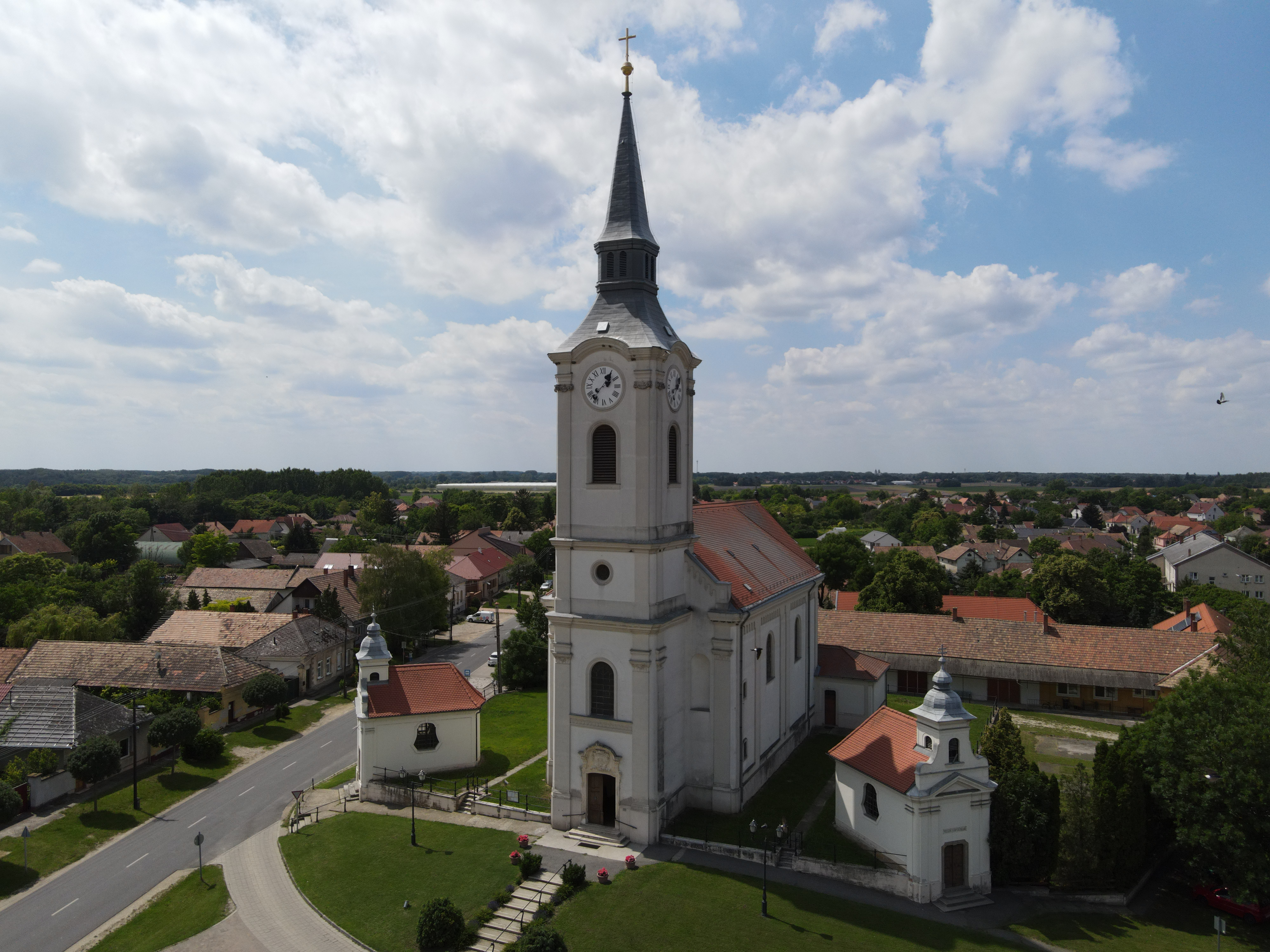 A templom és mellette a két kápolna olyan, mint egy anya két gyermekével. A Szent Kereszt-kápolna a 16. században, a Hősök kápolnája 1929-ben készült. A templomot 1770-1775 között Zichy Ferenc püspök építtette. A torony 47 méter magas, a templom belső tere szokatlanul tágas. A főoltár mögött Szent Miklóst ábrázoló olajkép és négy aranyozott faszobor látható (Szent Péter, Szent Pál, Szent Ágoston, Szent Márton). A diadalív görbületében helyezkedik el Szent Ferenc és a Szent Család mellékoltár. Az 1780 körül készült keresztelő kút vörös márvány talapzaton áll, tetején Jézus keresztelését ábrázoló szoborral. A templom teljes belső felújítását Samodai József festőművész, a falu szülötte végezte 1973-1975 között, aki két önálló seccóval pótolta a tönkrement freskókat (az egyiken Urunk színeváltozása látható, a másikon a Magyarok Nagyasszonya előtt hódolnak az Árpád-házi szentek).